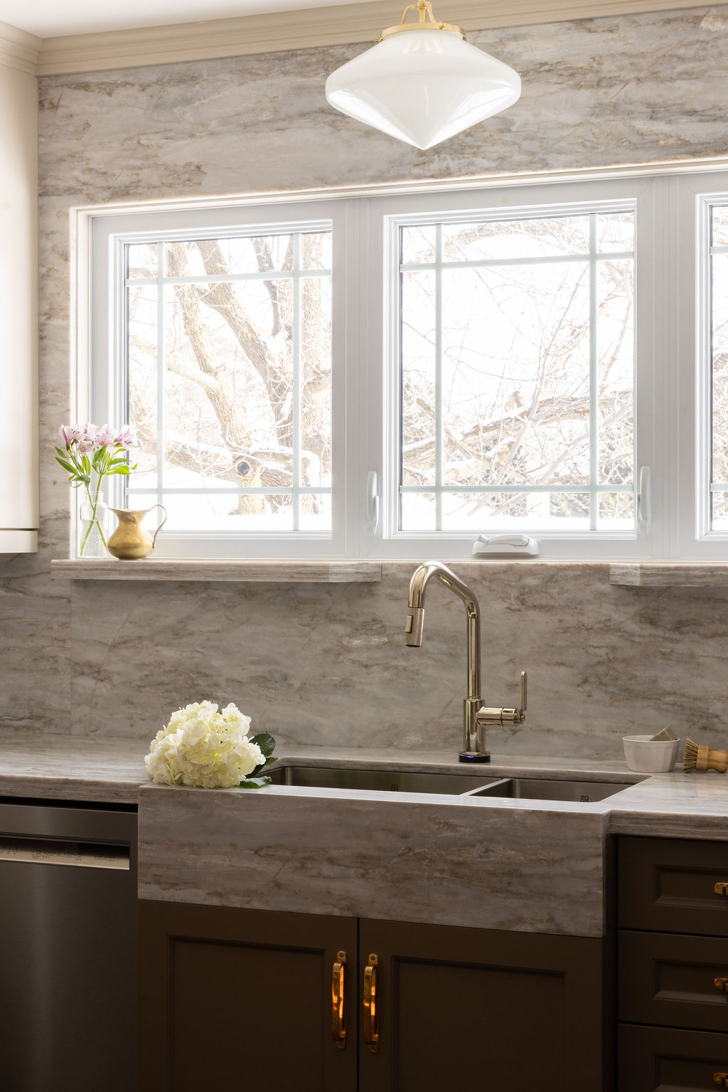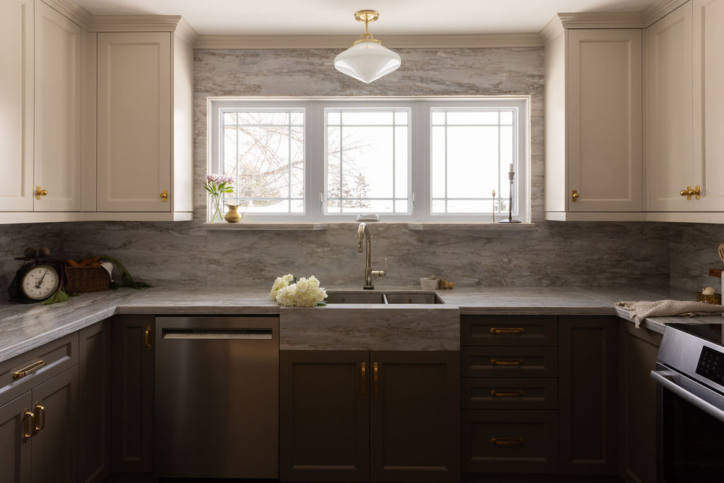 Distinctive design details include a custom paneled wall with unlacquered brass hooks to showcase the homeowner’s apron collection, two-tone kitchen cabinetry, Canadian-made HanStone quartz countertops, and a custom window ledge with integrated lighting. The result is a space that feels both inviting and considered — grounded in quality materials, subtle character, and design choices intended to age beautifully over time.